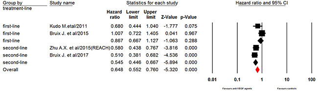 Four trials of the eight trials reported PFS data in the study patients. The pooled results demonstrated that the use of anti-VEGF agents significantly improved PFS in elderly HCC patients giving HR 0.65 (95% CI: 0.55–0.76, p < 0.001, Figure 2). Sub-group analysis according to treatment line showed that the use of anti-VEGF agents significantly improved PFS in elderly HCC patients who relapsed after a first-line sorafenib treatment (HR 0.55, 95% CI: 0.45–0.67, p < 0.001, Figure 2), while the use of anti-VEGF agents as first-line treatment did not significantly improved PFS in this patients population (HR 0.87, 95% CI: 0.67–1.13, p = 0.29). Begg’s test and Egger’s test revealed no evidence of obvious publication bias (p = 0.50 and p = 0.56, respectively).