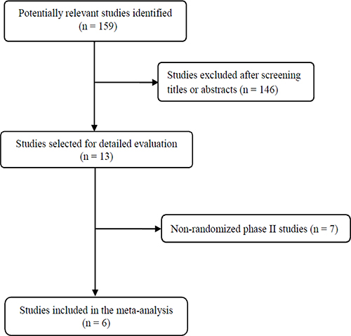 Figure 1 shows the flowchart of our study. A total of 159 potentially relevant studies were initially found, but 146 of them were excluded after screening the titles and abstracts. Of the remaining 13 potentially eligible studies, 7 were further excluded because they were non-randomized phase II trials. Finally, six studies were included in the meta-analysis [10–15].