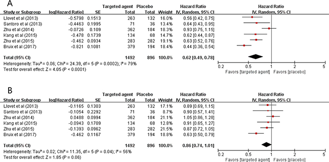 In terms of OS, targeted therapy tended to prolong survival time (HR = 0.86, 95% CI: 0.74-1.01, P = 0.06), compared with placebo (Figure 2B). The random-effects model was used because there was a significant heterogeneity (X2 = 11.35, P = 0.04, I2 = 56%).