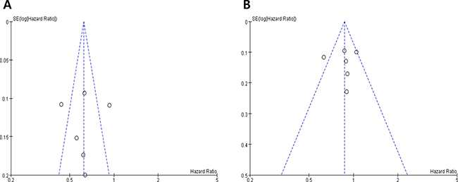 Begg’s funnel plots and Egger’s test showed no significant evidence of substantial publication biases for TTP (Begg’s P = 0.174, Egger’s P = 0.303) and OS (Begg’s P = 0.425, Egger’s P = 0.402) (Figure 3A and 3B).