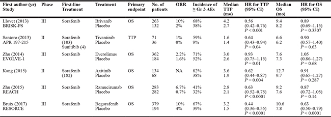 Table 1: Summary of the six randomized studies comparing a targeted agent and placebo in second-line treatment setting for advanced hepatocellular carcinoma
