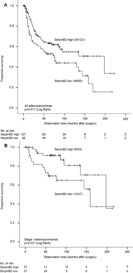 Low expression of SerpinB2 in primary tumors was associated with reduced LCSS, p = 0.017 (Figure 1A). Median survival time was 76 months in cases with low SerpinB2 expression (by median value) and 198 months for cases with high expression. A significant difference was also found for disease-free survival (DFS) (p = 0.023; median survival 41 versus 63 months, respectively). Among stage I adenocarcinomas, low SerpinB2 expression was still associated with reduced LCSS (p = 0.031) (Figure 1B).