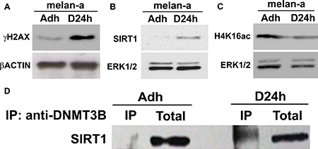 Figure 1: SIRT1 shows increased expression and associates with DNMT3B during stress condition. The expression of γH2AX (A), SIRT1 (B) and H4K16ac (C) were evaluated by western blot in adhered (ma) and deadhered (D24h) melan-a melanocytes. The expression of β-ACTIN or ERK was used as endogenous control. The interaction between SIRT1 and DNMT3B (D) was determined by co-immunoprecipitation in adherent (ma) and deadhered (D24h) melanocytes. Total: Total protein extract used in IP assay; IP: immunoprecipitated protein fraction.
