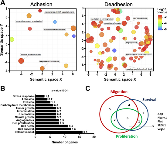 Figure 2: Under cellular stress, SIRT1 relocates to DNA sequences containing genes related to migration, survival, and proliferation. (A) Semantic similarities of Gene Ontology (GO) terms for the genes related to normal adhesion condition of melanocytes. The scatterplot shows the representative GO clusters in two-dimensional spaces. Bubble color indicates the p-value and the size indicates the frequency of GO terms. More semantically similar GO terms are closer in the plot. The mainly pathways found in adhesion were extracellular matrix organization, transmembrane transport and immune system process. The main pathways found under stress condition (deadhesion) were regulation of cell migration, proliferation, angiogenesis, negative regulation of cell death, regulation of growth, among others. (B) Biological pathways related to genes in which SIRT1 is associated during deadhesion. (C) Venn diagram showing the number of genes related to migration, survival and proliferation in which SIRT1 has associated to during deadhesion.