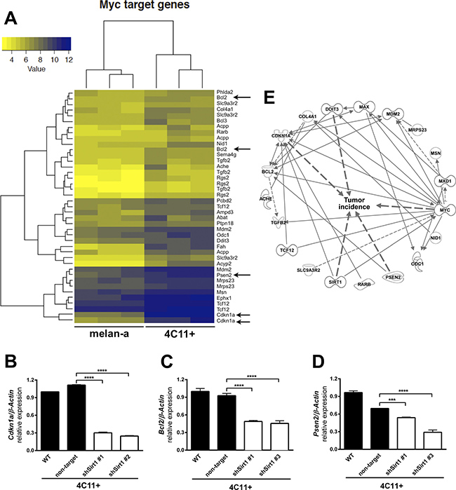Figure 6: Down-regulation of SIRT1 leads to an increase of Mxd1 expression and subsequent downregulation of MYC target genes. (A) Heatmap showing increased expression of MYC targets in 4C11+ melanoma cells compared to melan-a melanocytes obtained by microarray assays (color key chart with respective values is given). Arrows indicate Cdkn1a, Bcl2 and Psen2 as some of MYC targets in 4C11+ melanoma cells. Expression of Cdkn1a (B), Bcl2 (C) and Psen2 (D) was determined by RT-qPCR in non-metastatic 4C11- and metastatic 4C11+ melanoma cell lines, control and silenced for SIRT1. (E) Illustration of the interrelation among MYC and SIRT1 target genes altered in our melanoma model by Ingenuity functional pathway analysis (IPA®) graphical database of networks of interacting genes (Ingenuity Knowledge Base, IKB®). Only genes with interactions are displayed and were further subjected to the built-in “Grow to Diseases & Functions” feature to detect genes related with “tumor incidence”. WT: wild type; non-target: non-target shRNA control; sh#: SIRT1 silenced clones. ***p < 0.0001, ****p < 0.00001.