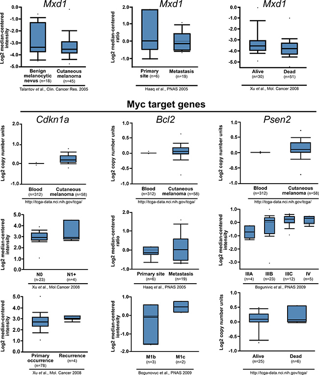 Figure 7: Decreased levels of Mxd1 and increased levels of Myc-target genes in human melanomas are related to poor prognosis. Data obtained from Oncomine database [40, 41, 42, 43] are shown across multiple independently published microarray studies as indicated. Boxes represent the interquartile range (25th–75th percentile). The bars denote the median. P <-1E4