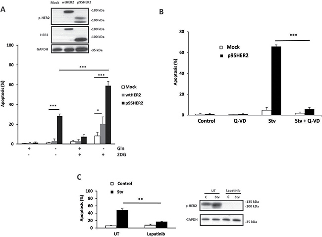 Figure 1: Increased sensitivity of p95HER2/611CTF-overexpressing cells to metabolic stress. (A) Cells were cultured for 30 h in medium containing the indicated additions and apoptosis was determined as described in Materials and Methods. Western blotting shows the expression of p-HER2 (Tyr1248) and total HER2. (B) Apoptosis in mock and p95HER2/611CTF cells incubated for 30 h either in complete or Stv medium (glutamine-free medium + 10 mM 2DG) in the presence or absence of Q-VD (20 μM). (C) p95HER2/611CTF cells were incubated in control or Stv medium either in the presence or absence of Lapatinib (5 μM), for 30 h to measure apoptosis (left panel) or for 16 h to analyze p-HER2 expression (right panel). Error bars, standard deviation (SD) from three independent experiments. ***P < 0.001, **P < 0.01, *P < 0.05.