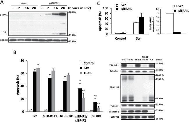 Figure 2: Role of the extrinsic pathway of apoptosis in metabolic stress-induced cell death. (A) Mock or p95HER2/611CTF cells were cultured in starvation medium for the indicated times. Following these treatments, caspase-8 activation was assessed by western blotting. Results are representative of three independent experiments. (B) p95HER2/611CTF cells were transfected for 48 h either with a scrambled oligonucleotide (Scr) or with the indicated siRNAs targeting TRAIL-R1, TRAIL-R2, or Caspase-8. Cells were then cultured either in complete or Stv medium, or treated with soluble TRAIL (50 ng/mL) for 30 h and apoptosis was determined (left panel). Error bars, SD from three independent experiments. **P < 0.01, *P < 0.05. Protein knockdown was assesed by western blotting (right panel). (C) p95HER2/611CTF cells transfected with either a siRNA targeting TRAIL or a scrambled oligonucleotide were incubated for 30 h in complete or starvation medium and apoptosis was determined (left panel). Results show the average and range of two independent experiments. TRAIL knockdown was assessed by RT-qPCR (right panel) as described in Materials and Methods.