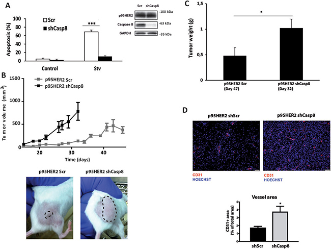 Figure 3: Caspase-8-dependent inhibition of tumor growth. (A) p95HER2/611CTF cells stably expressing a Scrambled or a Caspase 8-targeting shRNA were cultured either in complete or starvation medium and apoptosis was measured (left panel). Caspase-8 knockdown was determined by western blotting (right panel). Error bars, SD from three independent experiments. ***P < 0.001. (B) Subcutaneous growth of p95HER2/611CTF cells stably expressing a Scrambled or a Caspase 8-targeting shRNA injected in SCID-bBeige mice. Representative pictures were taken at day 30 after injection. (C) End-stage tumor weight in mice injected with p95HER2/611CTF cells stably expressing either a Scrambled oligonucleotide or a Caspase-8-targeting shRNA (n = 8). Graphs shown mean ± SEM. *P < 0.05. (D) Representative images and quantification of CD31+ tumor vessel area in mice injected either with p95HER2shScr or p95HER2shCasp8 cells (n = 8). The vessel area was calculated by the percentage of CD31 area per field.