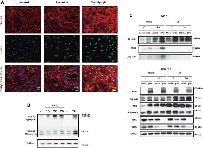 Figure 4: Metabolic stress induces TRAIL DISC formation at the plasma membrane in p95HER2/611CTF cells. (A) Confocal microscopy analysis of TRAIL-R2 distribution in p95HER2/611CTF cells either incubated in complete or starvation medium or treated with 100 nM Thapsigargin for 21 h, in the presence of Z-VAD (20 μM). Merged images show labelling for DAPI, TRAIL-R2 and the Golgi Marker GM130. (B) p95HER2/611CTF cells were incubated either in complete or starvation medium for the indicated times, or treated with 100 nM Thapsigargin for 16 h before collecting samples to determine TRAIL-R2 levels. (C) Mock or p95HER2/611CTF cells were cultured either in complete or starvation medium, in the presence of Q-VD (20 μM) for 24 h prior to incubation on ice with bio-TRAIL (1 μg/ml) for 60 min. Unstimulated receptor controls (US) represent the addition of bio-TRAIL to an equivalent volume of lysate isolated from cells kept on ice without bio-TRAIL. DISC isolation and analysis was performed as described in Materials and Methods (upper panel). Lower panel shows western blot analysis of proteins in cell lysates. Data shown are representative of 3 independent experiments.