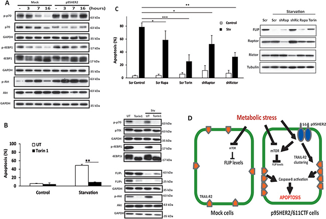 Figure 6: Role of mTOR complexes in apoptosis induced by metabolic stress. (A) Cells were cultured in Stv medium for the indicated times. Following these treatments, mTORC1 and mTORC2 activation (p-p70/S6K, p-4EBP1 and p-AktSer473), was assessed by western blotting. Results are representative of 4 independent experiments. (B) Left panel shows apoptosis in p95HER2/611CTF cells cultured in complete or stv medium in the presence or absence of Torin-1 (250 nM). FLIP levels and mTORC1/mTORC2 activities were determined by western blot analysis (right panels). (C) Apoptosis in p95HER2/611CTF cells stably expressing a Scrambled, Raptor or Rictor shRNA cultured either in complete or stv medium (left panel). Where indicated, Rapamycin (5 μM) or Torin (250 nM) were added to the medium. Levels of FLIP, Raptor and Rictor proteins upon 16 h of treatment are shown in the right panel. Error bars, SD from three independent experiments. ***P < 0.001, **P < 0.01, *P < 0.05. (D) Schematic overview of the differential response to metabolic stress in control and p95HER2/611CTF cells.