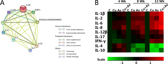 Multiple inflammatory cytokines were widely contact, and we researched the relationship of their coding genes through string network analysis. In Figure 5A, we studied 9 genes coding nine inflammatory cytokines. The predicted protein-protein interaction network showed that there might be a functional link between those proteins of genes we observed, some of which have been supported by other studies. Differently colored lines between genes present different meaning as labeled. The IL-1β (IL-1B) is co-expressed with genes of IL-6, IL-8 (EMF1), IL-10, IL-12β (IL-12B) and IFN-γ (ENSGALG00000009903). Most of cytokines were related with others, only IL-10 can mine text with all the other cytokines. It might function as the local immune controller or even inducer. To shed light upon this, a heat map showed the mRNA level of inflammatory cytokines in all groups (Figure 5B), its standard deviation (SD) was shown in Supplementary Table 1. These results revealed that although the level of IL-12β, IL-17 and IFN-γ have some tendencies to be inhibited in the first 4 weeks, a strong rebound was also detected after then. Other inflammatory cytokines, including IL-1β, IL-2, IL-6 and IL-8 showed statistical elevations in all weeks. Contrarily, the mRNA levels of IL-4, IL-10 displayed increase in 4 weeks then decrease during 8 weeks and 12 weeks time-dependently in kidney tissue suffered from Cu or/and As.