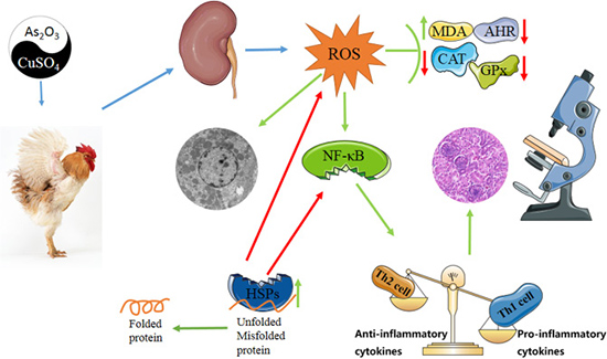 During the copper smelting process, the discharges of tailings containing copper and arsenic lead to long-term accumulation through the biogeochemical circle and threating the health of animals and humans. Especially, chicken is one of the most favorite protein source for humans, which will eventually cause copper and arsenic accumulation in human body through food chain. Despite there has been quite a few studies on the toxicity of copper or arsenic, little study was reported about their combination in chicken. In this study, the levels of inflammatory mediators and HSPs were detected by qRT-PCR or Western blotting. In order to monitor renal function, the ultrastructural and histopathological changes and antioxidant status were also measured by experimental pathology and biochemistry. Therefore, in the light of perceived threat from environmental pollutants and foodstuffs, the present study was designed with an aim to assess the nephrotoxicity of copper and arsenic individual or combined exposure from the view of oxidative damage and immunity, this study will also offer basic understanding on the protective role of HSPs.