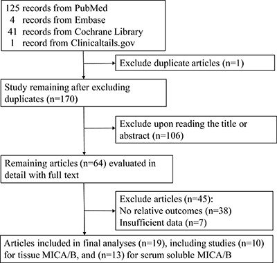 Based on current knowledge, low level of sMICA/B in serum and high expression of MICA/B are expected to be associated with less immune escape and stronger cytolytic ability of effector cells, respectively[24–26]. And serum soluble MICA/B and cancer cell-surface MICA/B are detected by two different methods. At the same time, these up- or down- regulated molecules on cancer cell surface or in patient serum are all associated with patients’ survival. Therefore, we conducted a systematic review and two meta-analysises to establish pooled estimates for survival outcomes based on sMICA/B serum levels and MICA/B cell surface expression in different types of cancers.