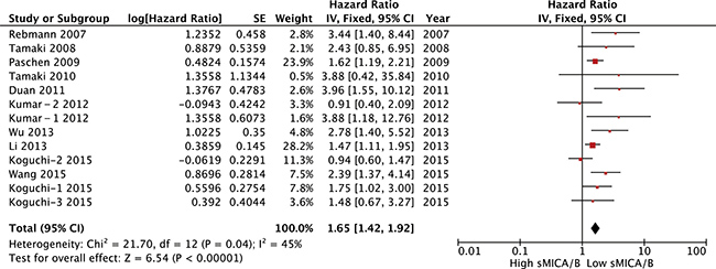 The endpoint used in this meta-analysis was OS. For MICA/B, study-defined binary variables indicating either the presence (versus absence), positive (versus negative), or high (versus low) expression were used and described as “high” or “low” MICA/B expression. For sMICA/B in serum, study-defined binary variables indicating either more (versus less) or high (versus low) were also described as “high ” or “low” level.