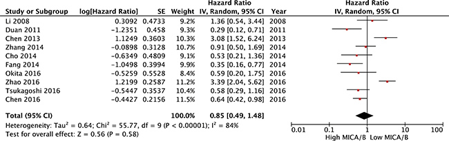 OS was reported in 10 studies of MICA/B expression in a total of 1,183 cancer patients. The meta-analysis of all these studies revealed a significant association between MICA/B expression and OS. No statistically significant association was observed between high MICA/B expression and longer OS (HR = 0.85, (95% CI [0.49–1.48], P = 0.58). The random-effects model was adopted to determine the significance of heterogeneity (I2 = 84%, P < 0.00001; Figure 3).