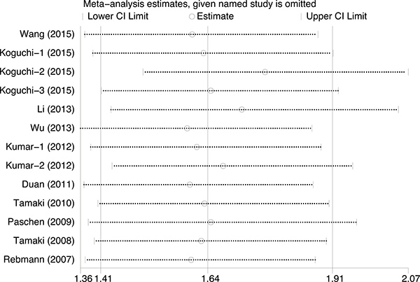 The publication bias of the present meta-analysis was evaluated by funnel plot. The shape of the funnel plot was almost symmetrical. To test the stability of meta-analysis of sMICA/B and OS, we performed a sensitivity analysis by sequentially removing each eligible study. And the present meta-sensitivity analysis did not suggest an undue influence of any single study (Figures 4, 5 and 6).
