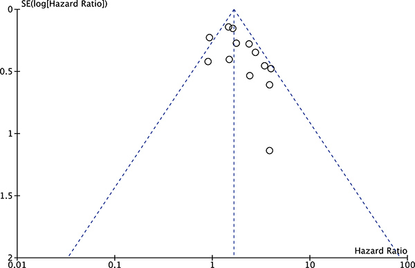 Figure 5: Funnel plot of the bias for the analysis of the independent role of soluble MICA/B in OS in the different cancer types.