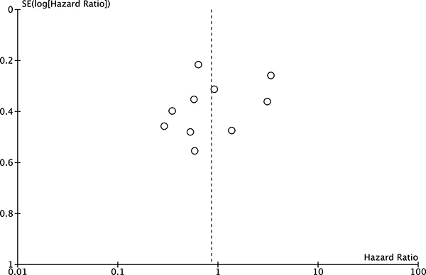 Figure 6: Funnel plot of the bias for the analysis of the independent role of MICA/B in OS in the different cancer types.