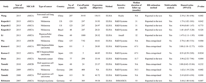 Table 1: Baseline characteristics for soluble MICA/B related studies included in meta-analysis