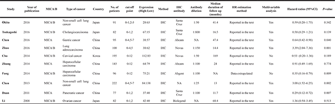 Two investigators (YJ.Z and NF.C) independently summarized the studies meeting the inclusion criteria and performed data extraction using a predefined form, recording: author, year of publication, MICA or MICB or sMICA or sMICB, sample size, cancer type, median follow-up time, country, scoring protocols to identify MICA/B expression, cut-off point to identify sMICA/B, expression (High: Low), method of study, outcome of univariate and/or multivariate analysis (including P-values, hazard ratios [HR], and 95% confidence intervals [CI]).
