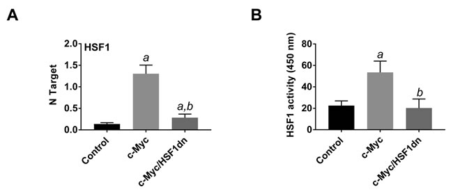 Figure 3: HSF1 is overexpressed and strongly activated in c-Myc mice. A. HSF1 mRNA levels as assessed by reverse-transcription real-time PCR. Number target (NT) = 2-ΔCt, wherein ΔCt value of each sample was calculated by subtracting the average Ct value of the HSF1 gene from the average Ct value of the β-actin gene. B. HSF1 activity, as determined using the HSF1 ELISA kit (Enzo Life Sciences), following the manufacturers’ instructions. Tukey–Kramer test: P < 0.0001 a, vs control (mice injected with empty vector); b, vs c-Myc mice. Ten mice per each group were analyzed.