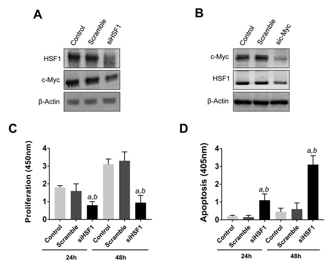 Figure 6: Reciprocal regulation of HSF1 and c-Myc and growth restraint following HSF1 silencing in the mouse HCC3-4 c-Myc cell line. A. At the molecular level, HSF1 silencing leads to c-Myc downregulation, as assessed by Western blot analysis. B. Similarly, knockdown of c-Myc by siRNA triggers downregulation of HSF1. Equivalent results were obtained in HCC4-4 cells (Supplementary Figure 4). β-Actin was used as a loading control. C., D. Suppression of HSF1 expression by specific siRNA for 24h and 48h results in decreased proliferation and augmented apoptosis. Tukey–Kramer test: P < 0.0001 a, vs control (untreated cells); b, vs scramble siRNA.