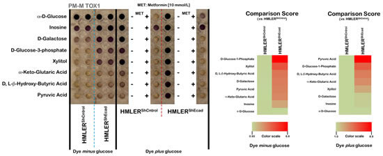 To further study the mechanistic aspects of these dramatic changes observed in the dye-reduction assay, we tested non-CS HMLERshCntrl parental cells and CS-like HMLERshEcad cells in the PM-M TOX1 MicroPlate in the presence of high concentrations of the mitochondrial poison metformin. The re-addition of glucose was apparently insufficient to rescue the cells from the cytotoxic effects of metformin, which completely blocked dye reduction by substrates that would presumably be oxidized mitochondrially but partially rescued the production of NADH from inosine.