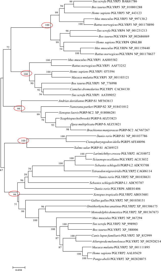 Figure 2: Evolutionary relationships of vertebrates’ PGRPs. The evolutionary history was inferred using the Neighbor-Joining method in MEGA7 software. The percentages of replicate trees in which the associated taxa clustered together in the bootstrap test (10,000 replicates) were shown next to the branches. The evolutionary distances were computed using the JTT matrix-based method and were shown in the units of the number of amino acid substitutions per site.