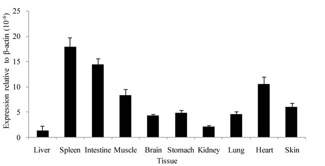 Figure 3: Tissue distribution of AdPGRP-S1 in selected tissues of normal salamanders. Expression of AdPGRP-S1 was analyzed by real-time qPCR and normalized to β-actin in each tissue of 4 animals.