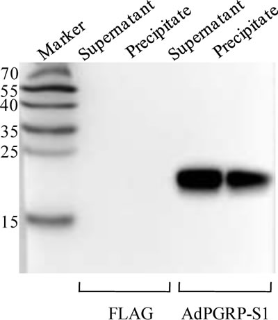 The AdPGRP-S1 fusion protein expressed in the HEK-293T cells was analyzed by Western blotting. A specific band of 15-25 kDa was detected in the supernatant and cell lysate of cells transfected with AdPGRP-S1 plasmid but not empty p3xFLAG vector, which was in line with the predicted molecular weight of AdPGRP-S1 (18 kDa). The results indicate that the AdPGRP1 fusion protein could be expressed as preprotein in intracellular region and could be secreted (Figure 4).