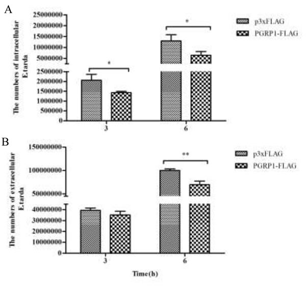 Figure 7: Inhibition of intracellular (A) and extracellular (B) E.tarda by AdPGRP-S1. HKE-293T cells transiently transfected with p3xFLAG-CMV-14 or pPGRP-S1-FLAG plasmids were infected with E.tarda. The numbers of bacteria were calculated at 3 h and 6 h post bacterial infection or post incubation with gentamicin. *P<0.05. **p < 0.01.