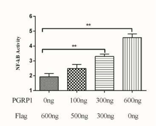 Figure 8: Effects of AdPGRP-S1 overexpression on the activity of the NF-кB reporter gene. The HEK-293T cells were transiently co-transfected with pRL-TK, NF-κB reporter vector, and pPGRP-S1-FLAG expression vector. The p3xFLAG-CMV-14 vector was used as a control. **p < 0.01.