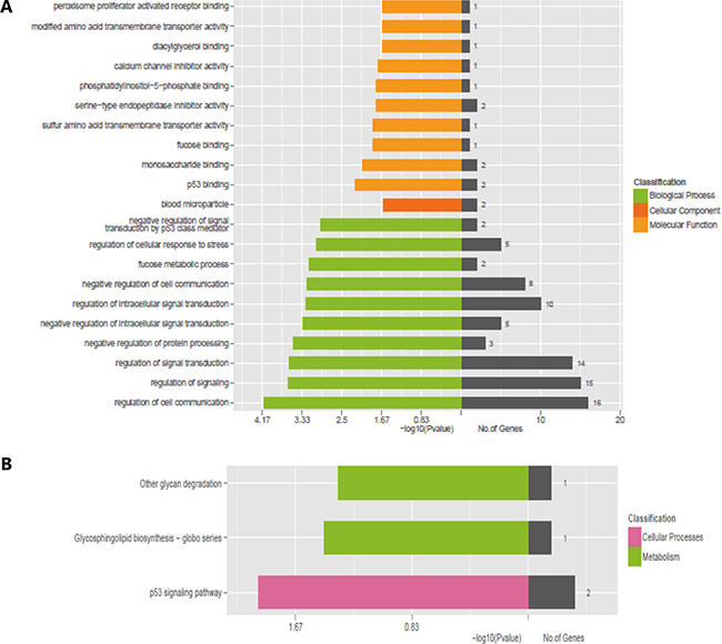 The functional annotation of lncRNAs is mainly predicted by their co-expression mRNAs, but there is still no functional annotation of most lncRNAs at present [38]. GO (Gene Ontology) [39] and KEGG (Kyoto Encyclopedia of Genes and Genomes) pathway [40] annotations are useful for analyzing differentially expressed lncRNAs related mRNAs functions. GO analysis is mainly composed of cellular components, biological processes and molecular functions. Pathways about the mRNAs associated with dysregulation of lncRNAs can be obtained by KEGG database besides.
