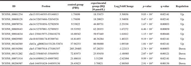 With the depth and development of researches, the study of lncRNAs has gradually shifted from human diseases to environmental exogenous chemicals. In this study, we performed profiles of differentially expressed lncRNAs and mRNAs in 2 pairs of low dose experimental group (HQ 20 μmol/L) and control group (PBS) (repeat 3 times). We also established co-expression networks for differentially expressed lncRNAs and mRNAs, with a view to comprehensively investigating the biological functions of lncRNAs. In addition, we have found several new lncRNAs that have not yet been annotated in major databases, suggesting that there is a possibility of a major breakthrough.