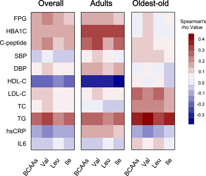 Figure 1: Correlation heatmap illustrating the relationship between circulating BCAAs and cardiometabolic quantitative phenotypes. Spearman correlation coefficients are presented in a blue-white-red color scheme. Dark red indicates a more positive correlation, and dark blue indicates a more negative correlation; white indicates no correlation. We present the corresponding heatmaps for the overall cohort, the adults and the oldest-old subjects.