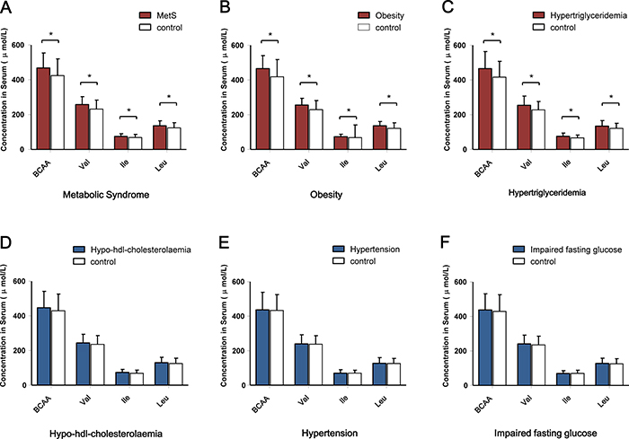 Figure 2: Comparison of the circulating BCAA levels according to the dichotomous cardiometabolic traits. (A) Serum BCAA levels according to the presence of MetS. (B) Serum BCAAs levels according to the presence of obesity. (C) Serum BCAA levels according to the presence of hypertriglyceridemia. (D) Serum BCAA levels according to the presence of hypo-HDL- cholesterolemia. (E) Serum BCAA levels according to the presence of hypertension. (F) Serum BCAA levels according to the presence of impaired fasting glucose. *P < 0.001.
