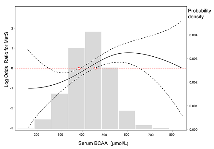 Figure 3: Log-transformed odds ratios for MetS by circulating BCAA levels. The lines represent the log-transformed odds ratios (95%CI) based on a generalized additive model (GAM) for BCAA levels. The cutoff point of the log ORs is 0, which corresponds to 1 on the ORs cutoff point. The bars represent the probability density, and 10 equally sized bins were set. Psmooth terms <0.001, and the estimated degrees of freedom for the model terms, namely, edf = 2.646.