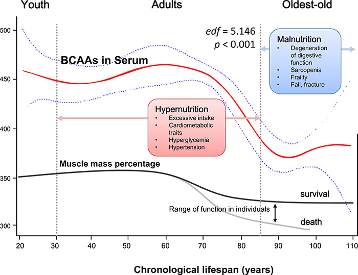 Figure 5: Schematic of a potential hypothesis for the whole-lifespan profile of circulating BCAA levels. A generalized additive model (GAM) was applied to fit a smooth curve according to our participants (21 to 110 years old). Psmooth terms <0.001, and the estimated degrees of freedom for the model terms, namely, edf = 5.146. As a nutrient-related metabolomics biomarker, BCAAs might link more to malnutrition in the oldest-old subjects due to factors such as sarcopenia and frailty rather than hypernutrition-related cardiometabolic diseases in adults.