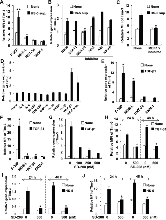 Figure 2: Upregulated Tim-3 expression in MDS cell lines. (A) MDS cell lines were cultured with or without HS-5 sup. for 48 h. The cells were pretreated with signal transduction inhibitors of STAT3, MEK1/2, JAK2, Akt/PI3K, and NF-κB for 2 h and then cultured in complete medium containing HS-5 sup., after which Tim-3 mRNA expression (B) and protein were analyzed (C). The concentrations of each inhibitor were 500 nM of STAT3 inhibitor V, 20 μM of U0126 (MEK1/2 inhibitor), 25 μM of AG490 (JAK2 inhibitor), 25 μM of LY294002 (PI3K/AKT signaling inhibitor), and 5 nM of PDTC (NF-κB inhibitor). (D) F-36P cells were cultured with the following cytokines for 2 days: 5 ng/ml of IL-8, 5 ng/ml of IL-6, 100 pg/ml of G-CSF, 10 ng/ml of GM-CSF, 10 ng/ml of MIP-1α, 10 ng/ml of IL-10, 10 ng/ml of VEGF, 10 ng/ml of IL-1β, and 2.5 ng/ml of TGF-β1. (E, F) MDS cell lines were cultured with 2.5 ng/ml of TGF-β1 for 48 h. (G–J) F-36P cells were pretreated with SD208, a selective inhibitor of TGF-βRI kinase, at optimal concentrations for 2 h, followed by incubation with 2.5 ng/ml of TGF-β1 (G, H) or HS-5 sup. (I, J) for 24–48 h. After incubation with HS-5 sup. or TGF-β1, the cell surface (A, C, F, H, J) and mRNA (B, D, E, G, I) expression of Tim-3 was analyzed by FCM and real-time qPCR, respectively. Data represent mean ± SD. *P<0.05, **P<0.005 compared with the results without HS-5 sup. or cytokines (A, E, F) and with the results without inhibitors (B, C, H, I, J).