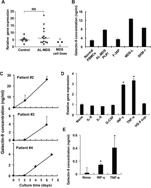 Figure 4: Expression and soluble form of galectin-9 in MDS patients and MDS cell lines. (A) Galectin-9 mRNA in PBMCs obtained from healthy controls, AL-MDS patients (blasts >95%), and MDS cell lines was determined by real-time PCR. Open rectangle, F-36P; closed rectangle, MDS-L; open circle, HNT-34; closed circle, SKM-1. NS, not significant. (B) Soluble galectin-9 in cell culture supernatant of normal PBMCs (n = 3), patient blasts and MDS cell lines were determined by ELISA. 1 x 106 cells/ml of MDS blasts or normal PBMCs and 2 x 105 cells/ml of MDS cell lines were cultured in complete medium and the culture supernatants were harvested after 2 and 3 days of culture, respectively. (C) 1 x 106 cells/ml of PBMCs obtained from AL-MDS patients were cultured and then the galectin-9 concentrations in culture supernatants acquired on days 2 and 6 (patients #2, #3) and days 2, 4, and 7 (patient #4) were analyzed using ELISA. (D) 2 x 105 cells/ml of F-36P cells were co-cultured with each the following cytokines for 2 days: 5 ng/ml of IL-8, 5 ng/ml of IL-6, 100 pg/ml of G-CSF, 10 ng/ml of IFN-γ, and 500 U/ml of TNF-α and HS-5 sup. Then galectin-9 mRNA expression was evaluated using real-time PCR. (E) Galectin-9 concentrations in the cell culture supernatant of F-36P cells treated with IFN-γ and TNF-α were quantified by ELISA. Data represent mean ± SD. *P<0.05 compared with the results without HS-5 sup. or cytokines (D, E).