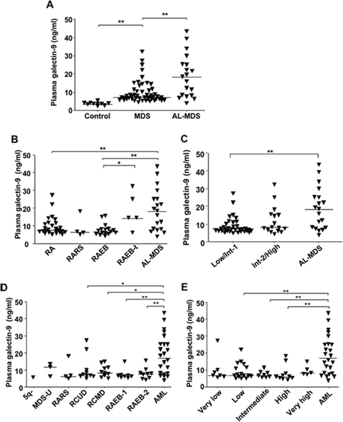 Figure 5: Soluble galectin-9 levels in MDS patients according to disease stage. Plasma galectin-9 concentrations were measured using ELISA. (A) Galectin-9 concentrations in plasma from 10 healthy donors, 51 MDS patients, and 19 AL-MDS patients. (B) Comparison of plasma galectin-9 levels in MDS patients according to the FAB classification: RA (n = 26); RARS (n = 3); RAEB (n = 16); and RAEB in transformation (RAEB-t; n = 5). (C) Comparison of plasma galectin-9 levels in MDS patients according to the IPSS: Low/Int-1 (n = 33) and Int-2/High (n = 17). (D) Comparison of plasma galectin-9 level in MDS patients according to the WHO classification: 5q- (n = 1); MDS-U (n = 3); RARS (n = 3); refractory cytopenia with unilineage dysplasia (RCUD; n = 10); refractory cytopenia with multilineage dysplasia (RCMD; n = 11); RAEB-1 (n = 8); RAEB-2 (n = 9); and AML (n = 23). (E) Comparison of plasma galectin-9 levels in MDS patients according to the WPSS: very low (n = 7); low (n = 17); intermediate (n = 8); high (n = 9); and very high (n = 5). Data represent mean ± SD. *P < 0.05, **P < 0.01. Int-1, intermediate-1; Int-2, intermediate-2.