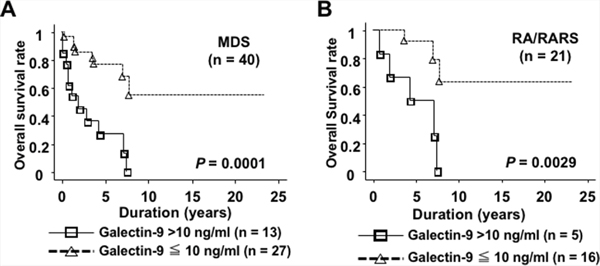 Figure 6: Plasma galectin-9 levels were associated with shorter OS times in MDS patients. (A) The high galectin-9 group of MDS patients (>10 ng/ml, solid line) had shorter OS compared with the low group (≤10 ng/ml, dotted line). (B) In MDS patients with RA/RARS, the high galectin-9 group had shorter OS in comparison with the low group.