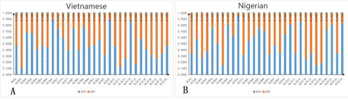Figure 1: Allele frequency distribution. Data from 30 InDel loci in Vietnamese (n = 300) and Nigerian (n = 140) populations. HLD, human locus deletion/insertion polymorphism; DIP+, long allele frequency; DIP-, short allele frequency. (A) Allele frequency distribution in Vietnamese; (B) allele frequency distribution in Nigerian.