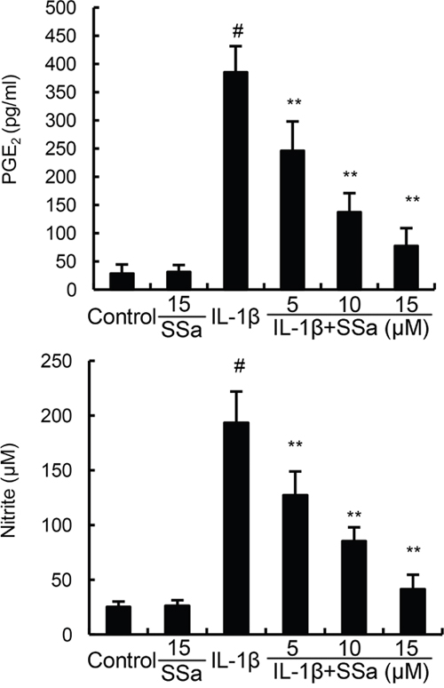 Figure 2: SSa inhibits IL-1β-induced NO and PGE2 production. The data presented are the means ± S.E.M. of three independent experiments. #P < 0.05 vs. control group; *P < 0.05, **P < 0.01 vs. IL-1β group.