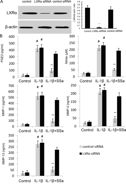 In conclusion, in the present study, we showed that SSa significantly inhibited IL-1β-induced inflammatory response by inhibiting NF-κB activation. Furthermore, SSa has been found to up-regulate the expression of LXRα, which subsequently inhibited the activation of NF-κB. SSa may be a potential therapeutic agent for osteoarthritis.