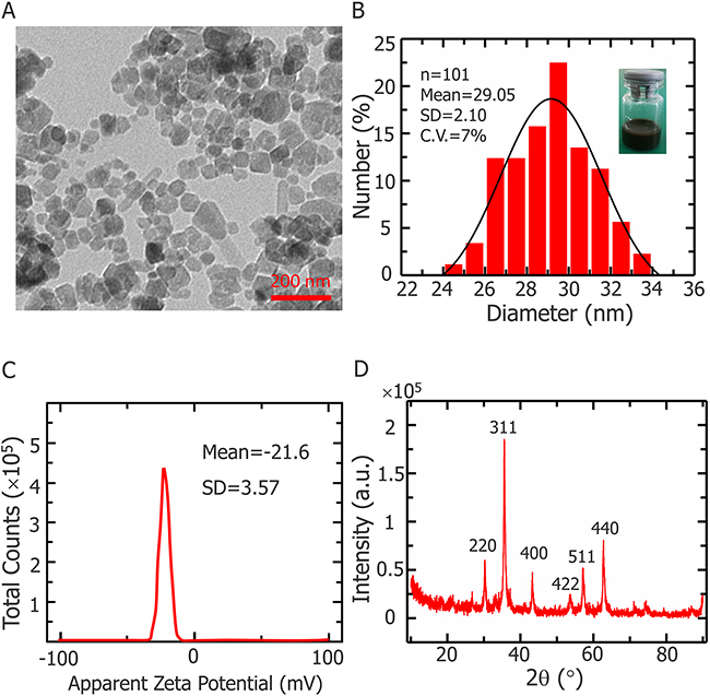 Figure 1 illustrates the characterization of Fe3O4 nanoparticles synthesized with a chemical coprecipitation method. The morphology of Fe3O4 nanoparticles were determined by transmission electron microscopy (TEM). Figure 1A shows that nanoparticles are uniform in size (~25 nm) and dispersed well in aqueous solutions. Size distributions of nanoparticles appear in Figure 1B, which is measured with dynamic light scattering (DLS) at 25 °C. Data for the apparent zeta potential of Fe3O4 nanoparticles are shown in Figure 1C, and the X-ray powder diffraction (XRD) patterns of the nanoparticles are shown in Figure 1D.