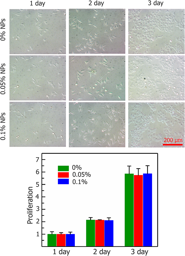 Figure 3: Proliferation of HepG2 cells after incubating with Fe3O4 nanoparticles (0, 0.05, and 0.1%) for 1, 2, and 3 days. Data are presented means ± SD (n=5).