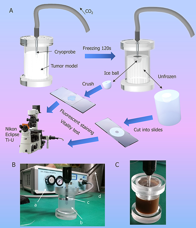 Figure 4: Illustration of cryosurgical device and process. (A) Schematic diagram of the experimental procedure of cryosurgery in tumor model. (B) Photo of experimental set-up. a. apparatus for cryosurgery; b. agarose model with HepG2; c. cryoprobe; d. CO2 container. (C) Agarose model with HepG2 and 0.1% (w/v) NPs.