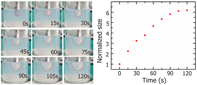 Figure 5: Photos of iceball (outline depicted with red lines) during cryosurgery experiment and growth curve.